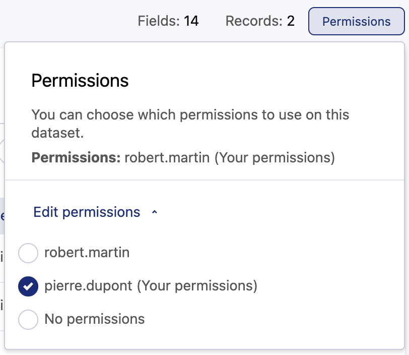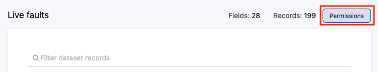 Tout d’abord, accédez à l’onglet Source de cet ensemble de données. Cliquez sur la source, ou sur Voir la source dans le menu à trois points qui apparaît lorsque vous survolez la source. La vue suivante s'affiche alors, où vous pouvez cliquer sur le bouton Permissions dans le coin supérieur droit.