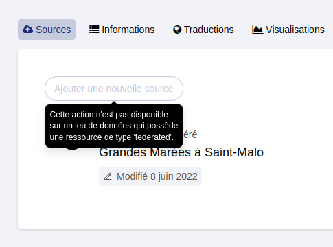 Certaines actions, comme l’ajout de sources ou de processeurs, ne sont pas disponibles pour un jeu de données qui utilise une ressource fédérée, par exemple un jeu de données du Data Hub Huwise. Ces actions sont soit désactivées dans le back office, comme Ajouter une nouvelle source dans la capture ci-dessous, ou n’apparaissent simplement pas, comme l’onglet Traitement.