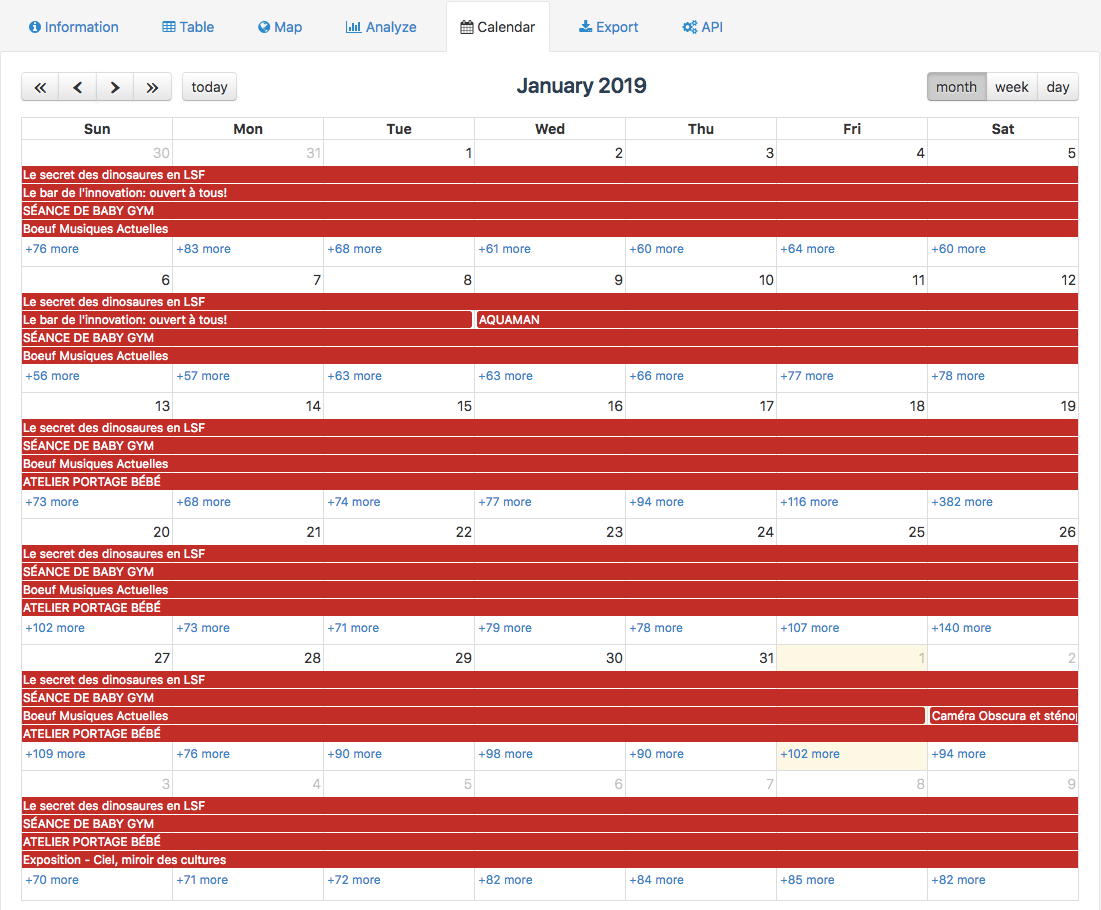 Il affiche un calendrier sur lequel les événements du jeu de données sont affichés. Lorsque vous cliquez sur un événement, son info-bulle associée s'affiche. Il contient de plus amples informations sur l'événement.