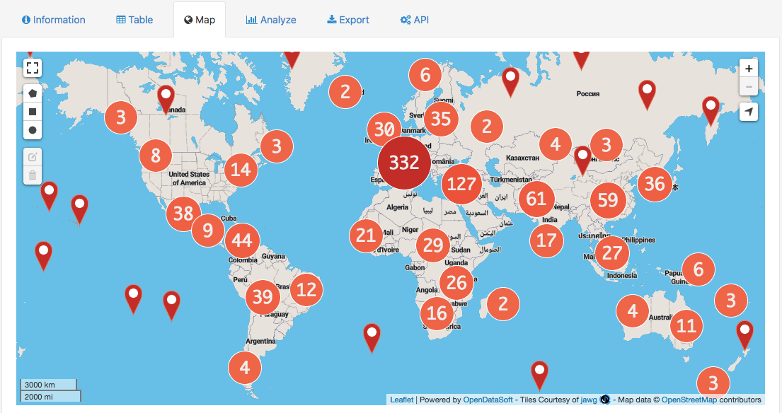 Il affiche une carte sur laquelle se trouvent des marqueurs de carte indiquant l'emplacement géographique d'un enregistrement du jeu de données. Lorsque vous cliquez sur un marqueur de carte, son info-bulle associée s'affiche. Il contient de plus amples informations sur l'enregistrement.
