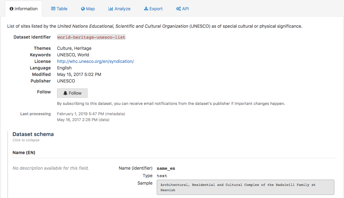L'onglet Informations donne accès à toutes sortes d'informations sur le jeu de données. Cet onglet est souvent l'onglet de destination par défaut lorsque vous cliquez sur une fiche de jeu de données du catalogue. Il précède également tous les autres onglets de visualisation, d'export et d'API.