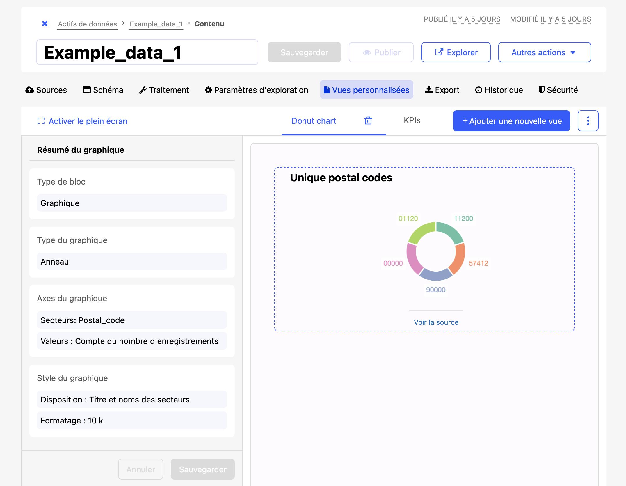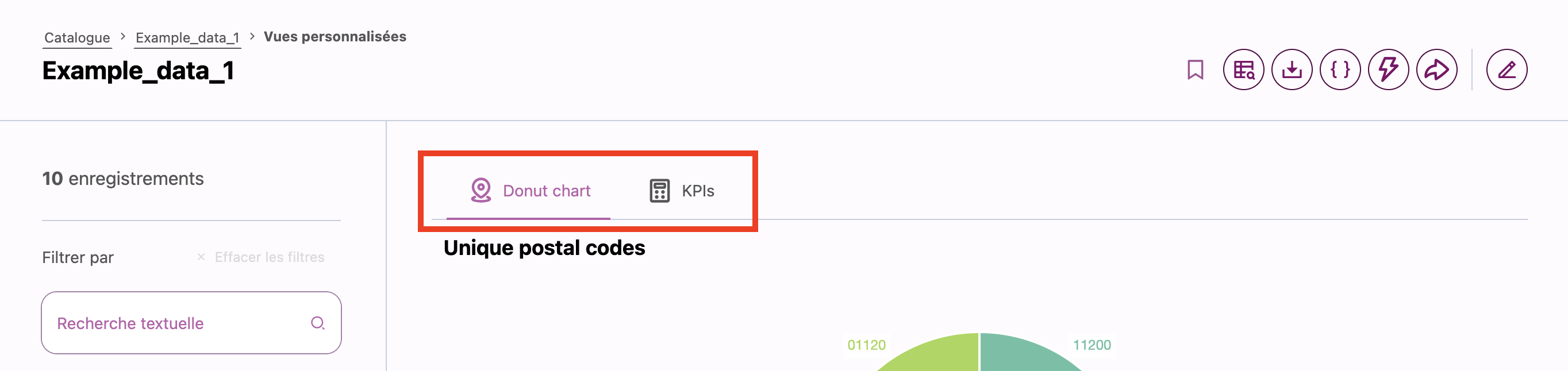 Les vues personnalisées sont utilisées pour offrir un aperçu visuel, à l'aide de tableaux, de graphiques, de cartes ou d'indicateurs clés, du contenu d'un jeu de données et des possibilités qu'il offre à l'utilisateur.