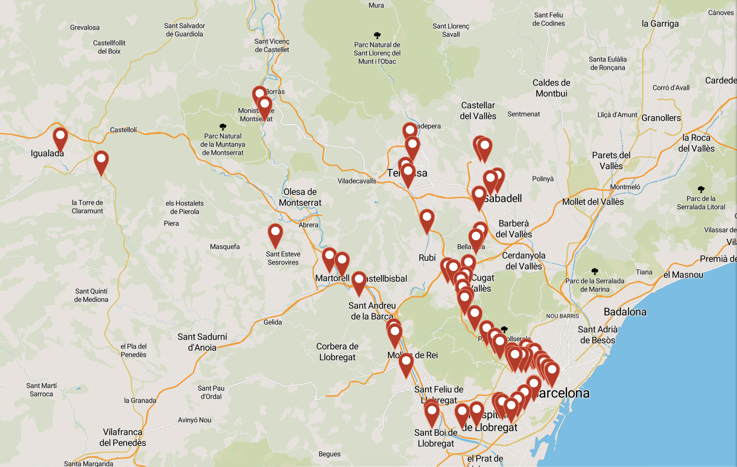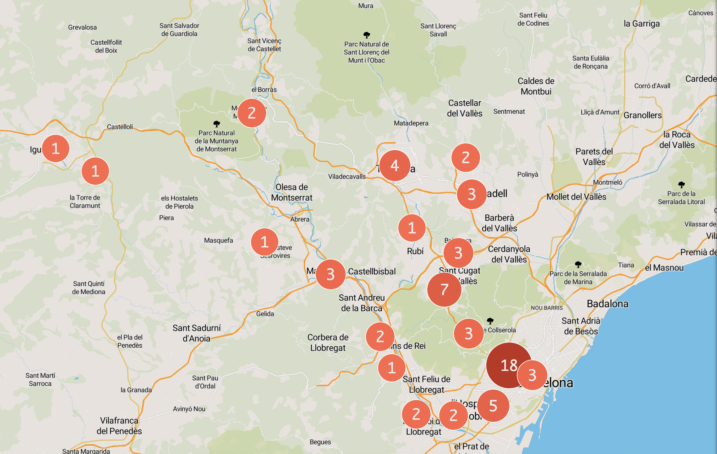 Si plus de la moitié des éléments sont des points, tous les éléments sont regroupés : les éléments proches les uns des autres sont regroupés en un seul cluster, un nombre indiquant le nombre d'éléments que le cluster regroupe. Pour les éléments qui sont des formes (polygones, lignes, etc.), leur centre de gravité est pris en compte lors de la localisation des clusters. Le fait de cliquer sur un cluster effectue un zoom avant, auquel cas les mêmes règles sont réappliquées et peuvent modifier l'affichage.