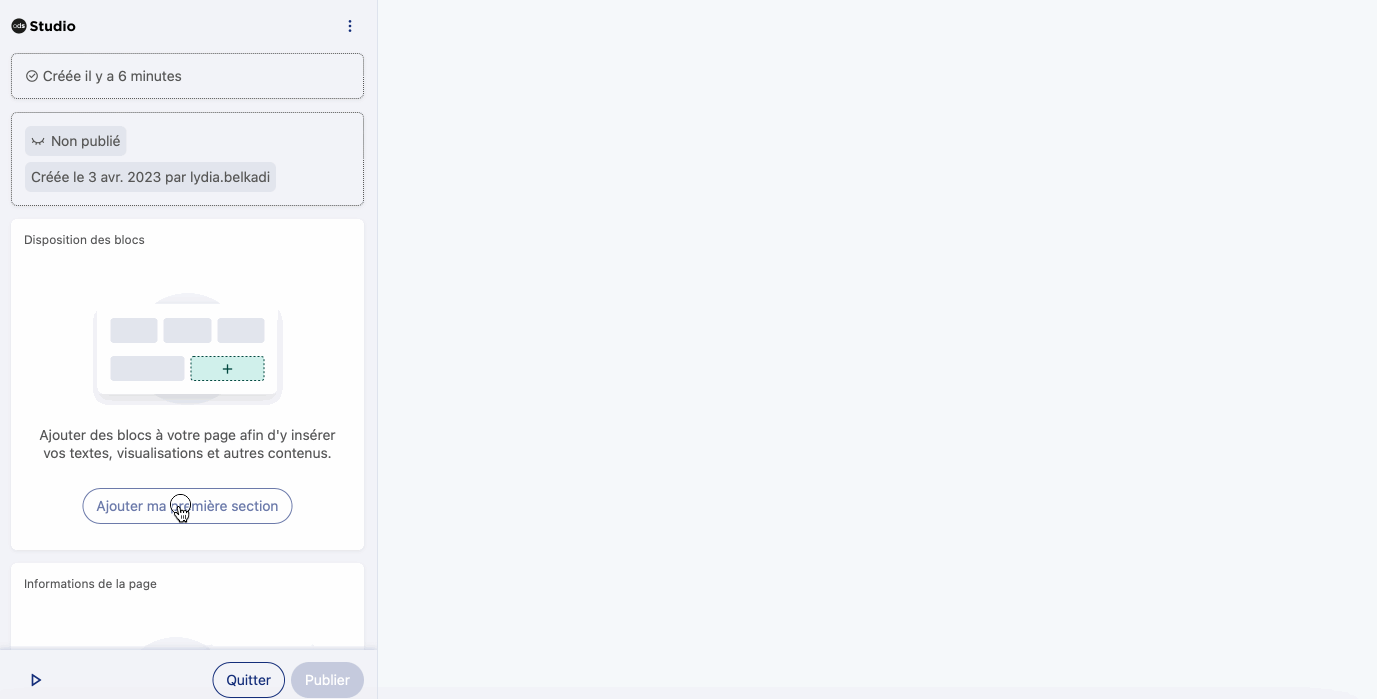 Si vous venez de créer la page et que vous n'avez pas encore créé de bloc, vous pourrez directement créer votre première section à partir d'un bouton.