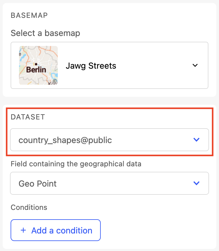 Selon ce qui est disponible dans le jeu de données, vous devrez peut-être préciser quel champ utiliser. Si un seul champ géographique valide est détecté, il sera sélectionné automatiquement.
