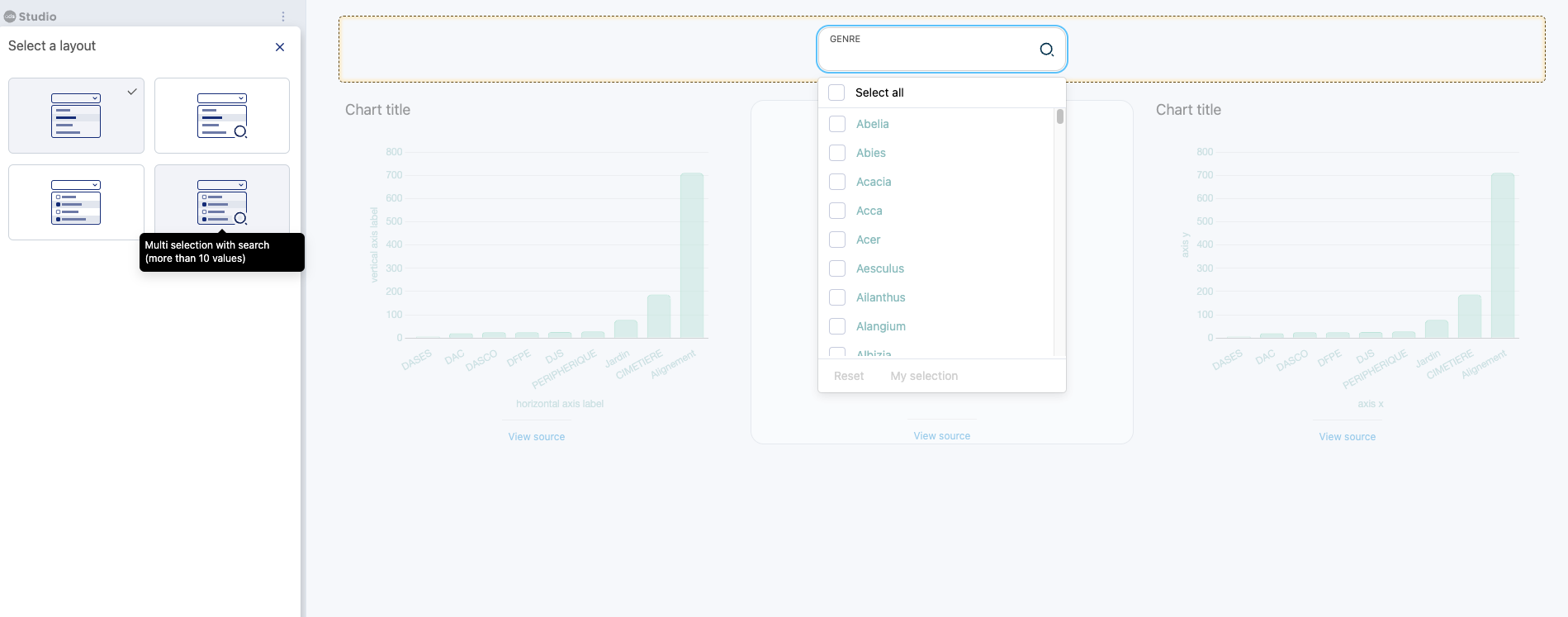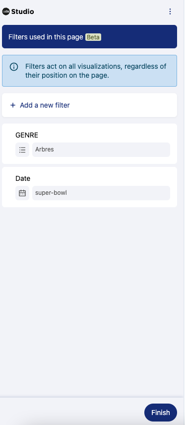 Lors de la création d'une page Studio, et plus généralement d'une page de visualisation de données, vous pouvez souvent utiliser des filtres pour rendre vos visualisations plus dynamiques.