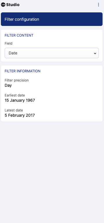 Après avoir sélectionné le bon champ, des informations sur la précision des données de date (minute/heure/jour/semaine/mois/année), ainsi que la date la plus ancienne et la plus récente de ce champ, apparaîtront afin que vous puissiez vous assurer que le champ est approprié pour votre page :