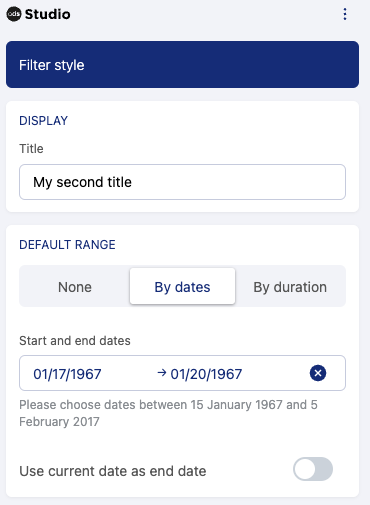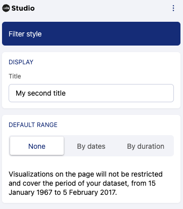La dernière étape de la configuration du filtre de date vous permet d'ajouter un titre facultatif et des valeurs par défaut. Aucune valeur par défaut n'est définie automatiquement, donc sauf indication contraire de votre part, les données affichées couvrent toute la plage de dates :