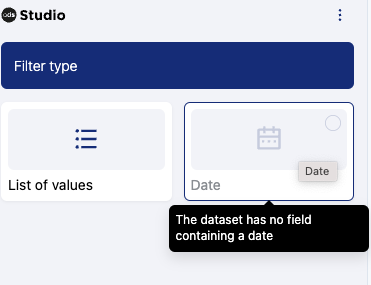 Si vous sélectionnez le filtre de date, vous devez d'abord choisir un jeu de données , puis un type de filtre.