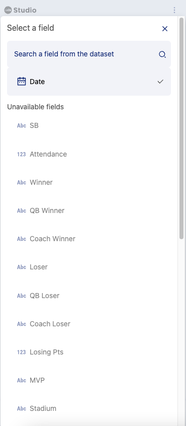 Vous devez d'abord choisir le champ qui contient la valeur de date que vous souhaitez utiliser pour filtrer vos données. Dans le sélecteur de champs, seuls les champs contenant des dates seront disponibles :