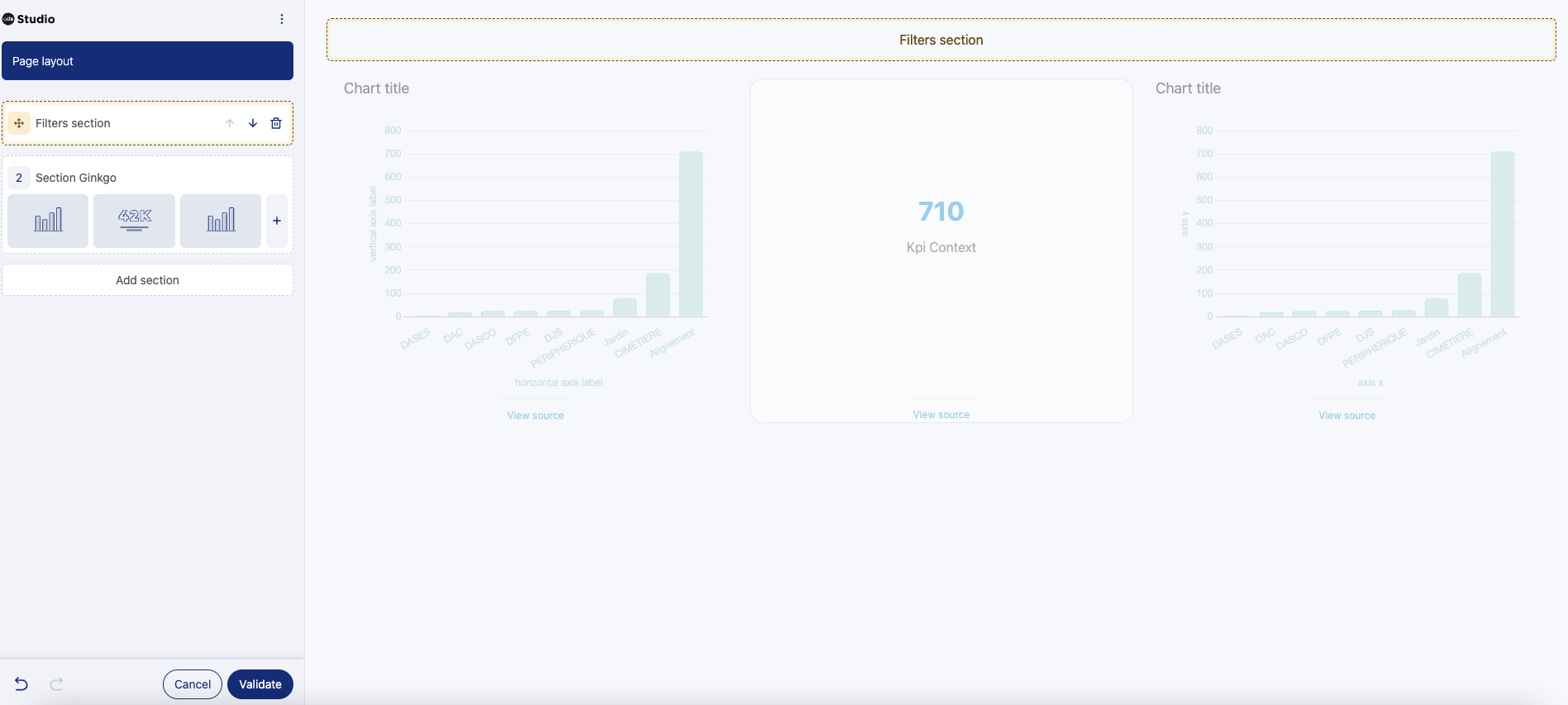 Après avoir cliqué sur le bouton Valider en bas de l'écran, les sections de filtres sont prêtes et définies dans votre page.