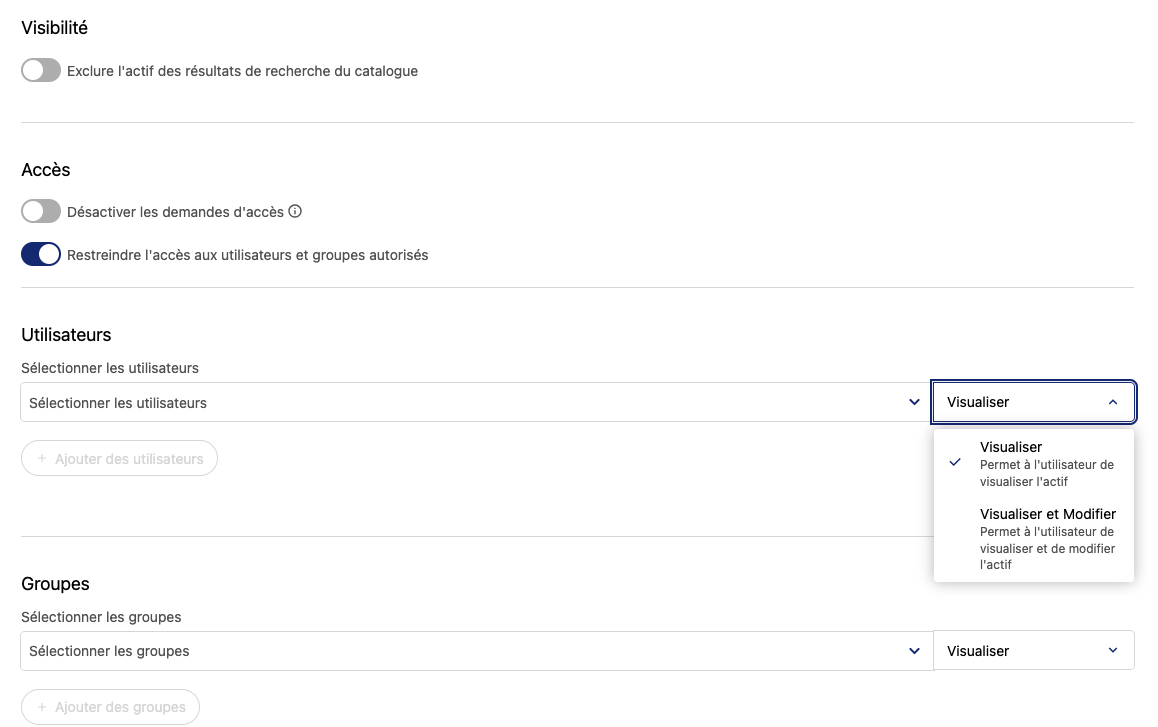 Vous y verrez des options de visibilité et d'accès communes à la plupart des autres actifs : Visibilité, la possibilité de désactiver les demandes d'accès, et les paramètres d'accès pour les utilisateurs et les groupes.