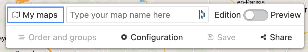 Tout ce que vous faites pour gérer vos cartes, à l'exception de l'enregistrement et du renommage (voir Renommer et enregistrer une carte) s'effectue depuis l'interface Mes cartes. Cette interface est accessible depuis le menu le créateur de carte affiché tout en haut de la carte.