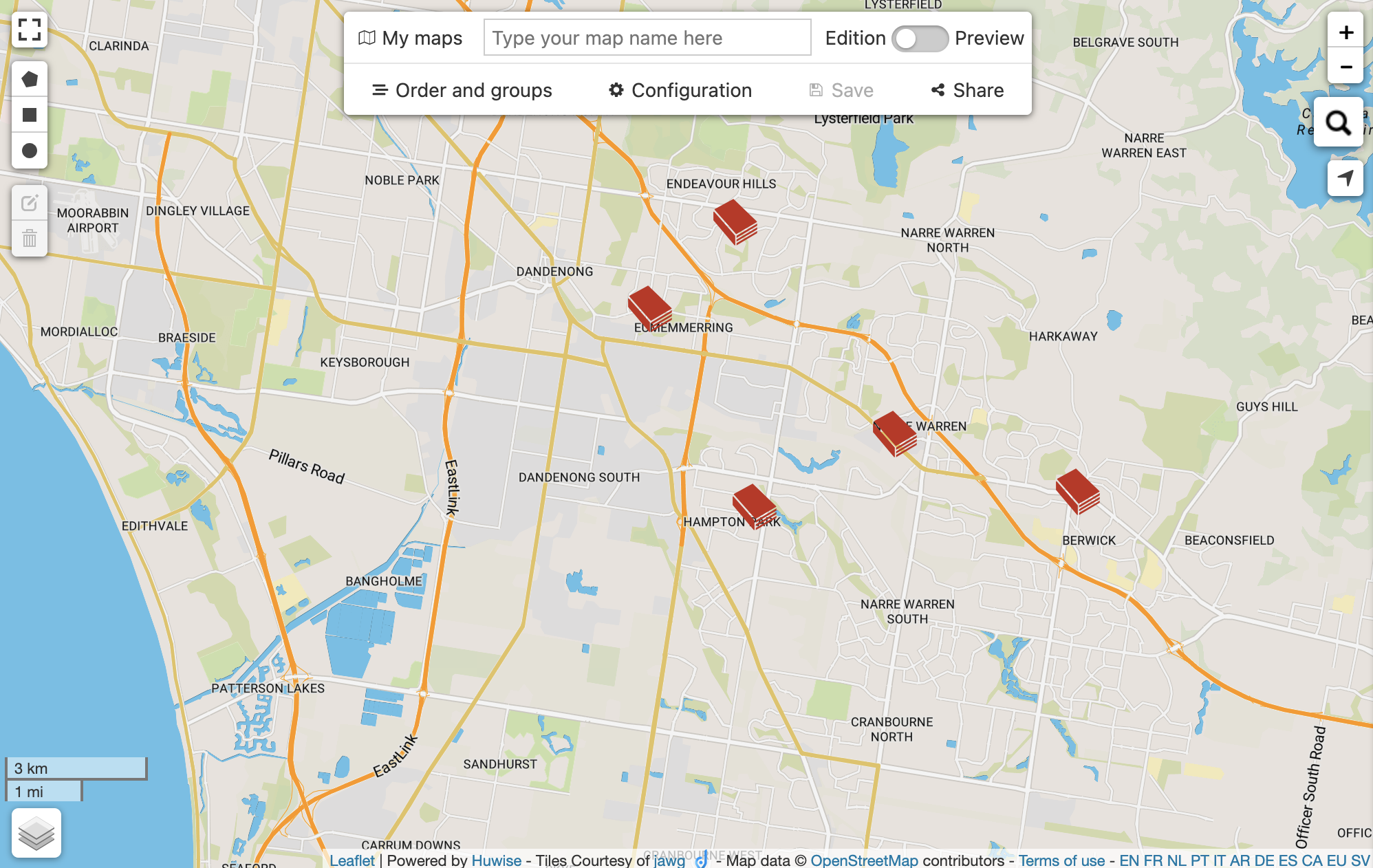 La zone d'édition des couches est située sur le côté droit de votre page, juste à côté de la carte. Utilisez cette partie de Cartes pour créer une carte multicouche.