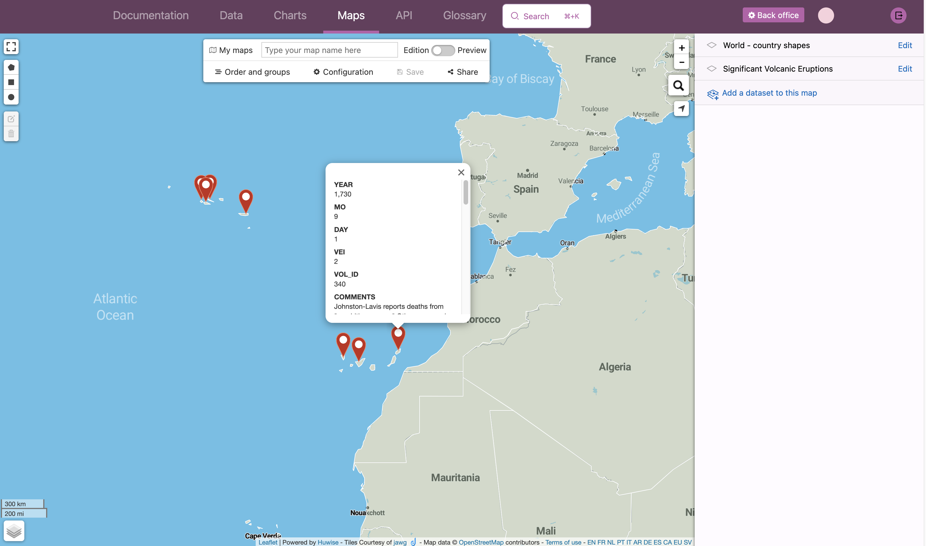 Pour utiliser Cartes, accédez à n'importe quel portail Huwise et recherchez-le via la navigation du portail (sur votre propre portail, il s'agit de l'onglet Cartes en haut de la page). Sinon, vous pouvez taper /map à la fin de l'URL de n'importe quel portail. Vous pouvez y utiliser les jeux de données du portail pour créer une carte, ou bien choisir parmi l'un des 14 000 jeux de données géoréférencés disponibles gratuitement via notre Data Hub.