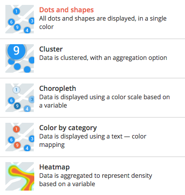 Les configurations de style affichées pour chaque mode de visualisation dépendent également de votre jeu de données. Selon le jeu de données que vous avez ajouté à votre carte Map Builder, vous ne verrez peut-être pas toutes les configurations expliquées dans cette documentation.