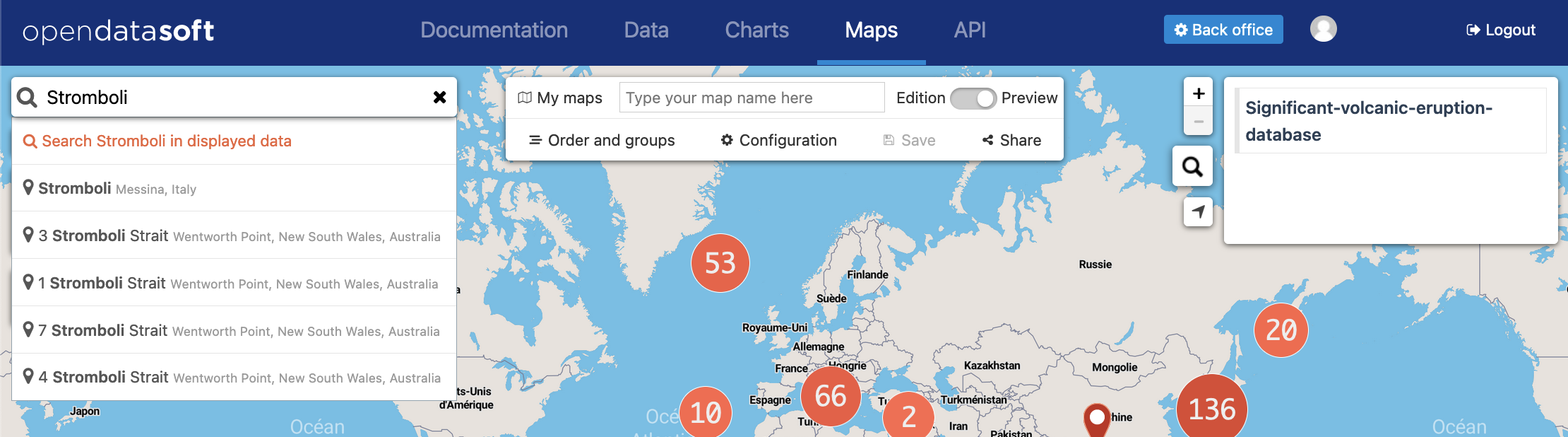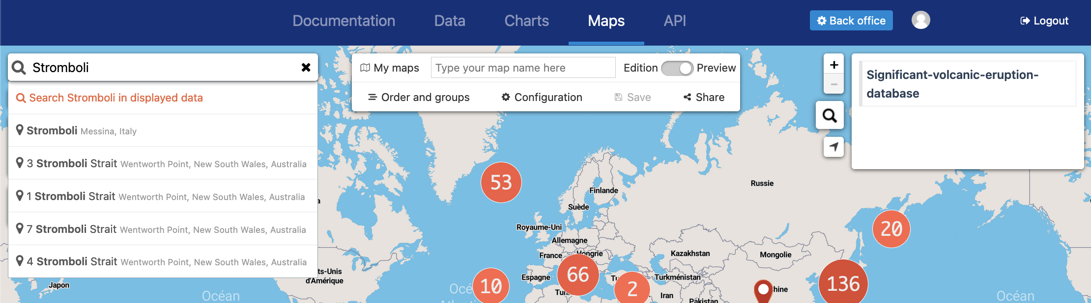 Vous pouvez utiliser la barre de recherche pour trouver des lieux ou des données sur votre carte. Pour cela, saisissez simplement un mot-clé dans la barre de recherche en haut à gauche de la carte. Par défaut, la barre de recherche renverra des résultats d'emplacement, et si vous cliquez sur un résultat d'emplacement, la carte se déplacera automatiquement vers cet emplacement.