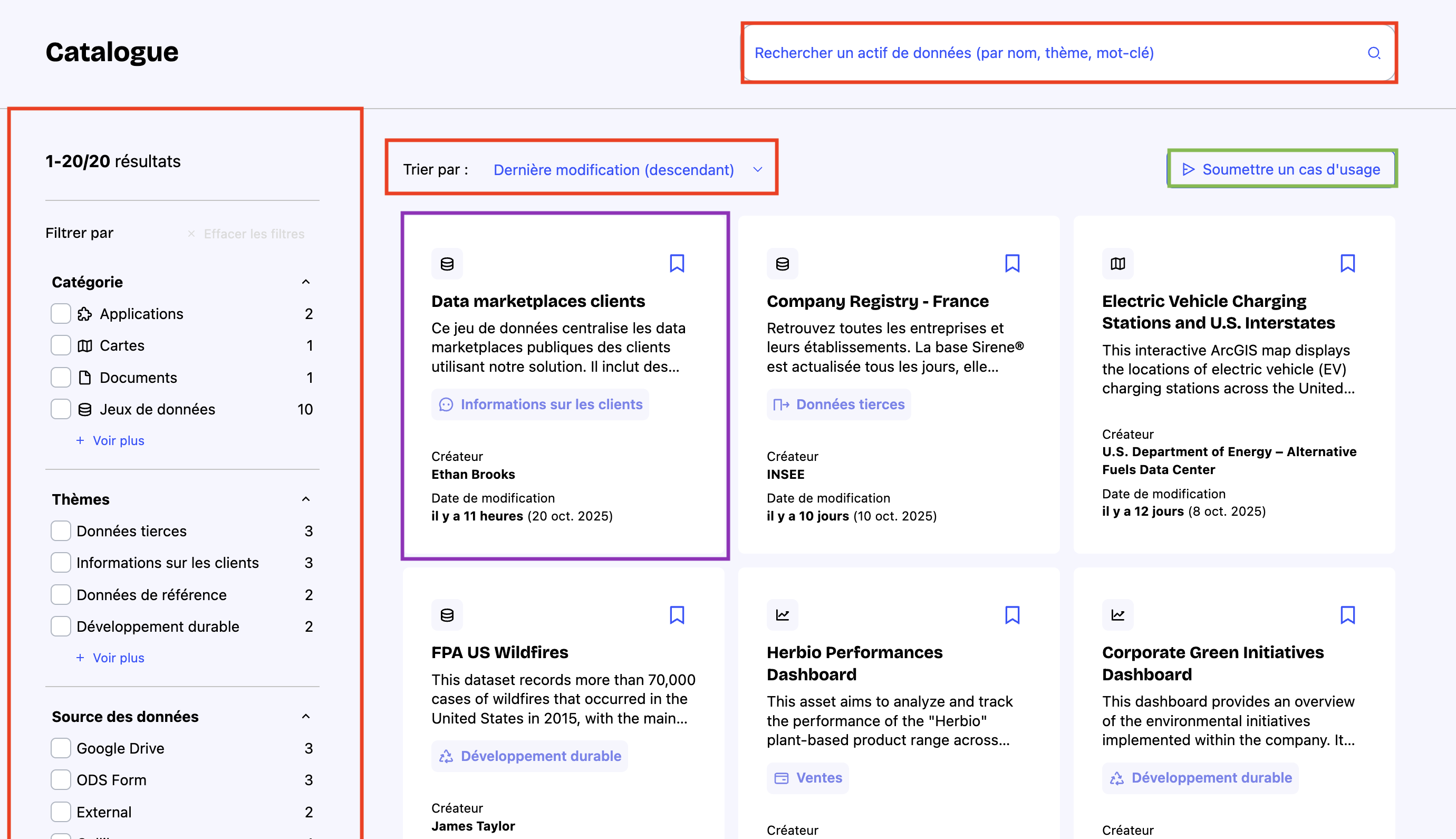 🔴 Rechercher des actifs de données en utilisant le tri, les filtres ou la recherche assistée par IA pour identifier rapidement les actifs les plus pertinents.