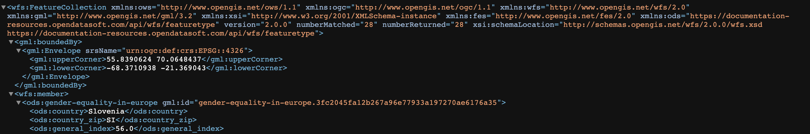 Ainsi, les éléments renvoyés par cette requête correspondent aux données du jeu de données "ods:gender-equality-in-europe" . Chaque ligne du jeu de données correspond à un membre (<wfs:member>).