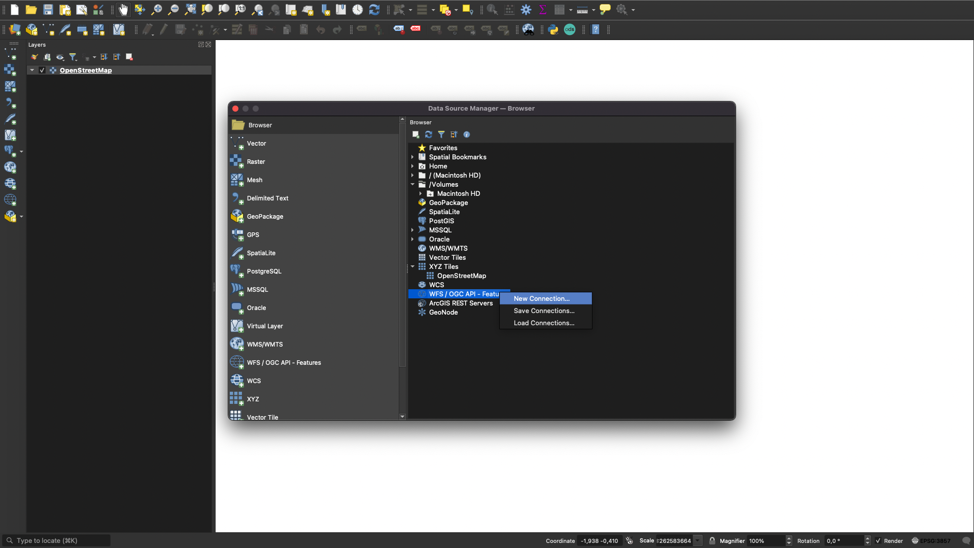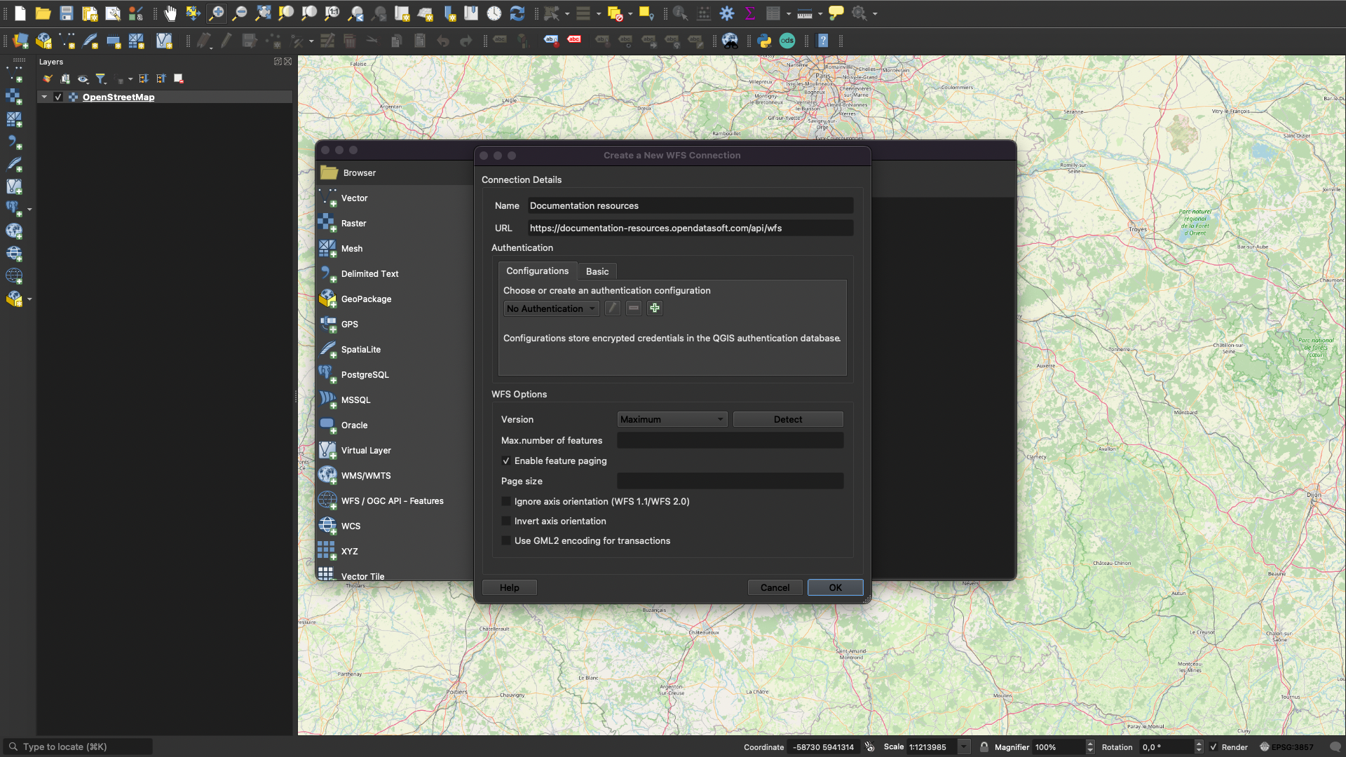 Ouvrez le Data Source Manager, ajoutez une couche OpenStreetMap, puis créez une nouvelle connexion WFS