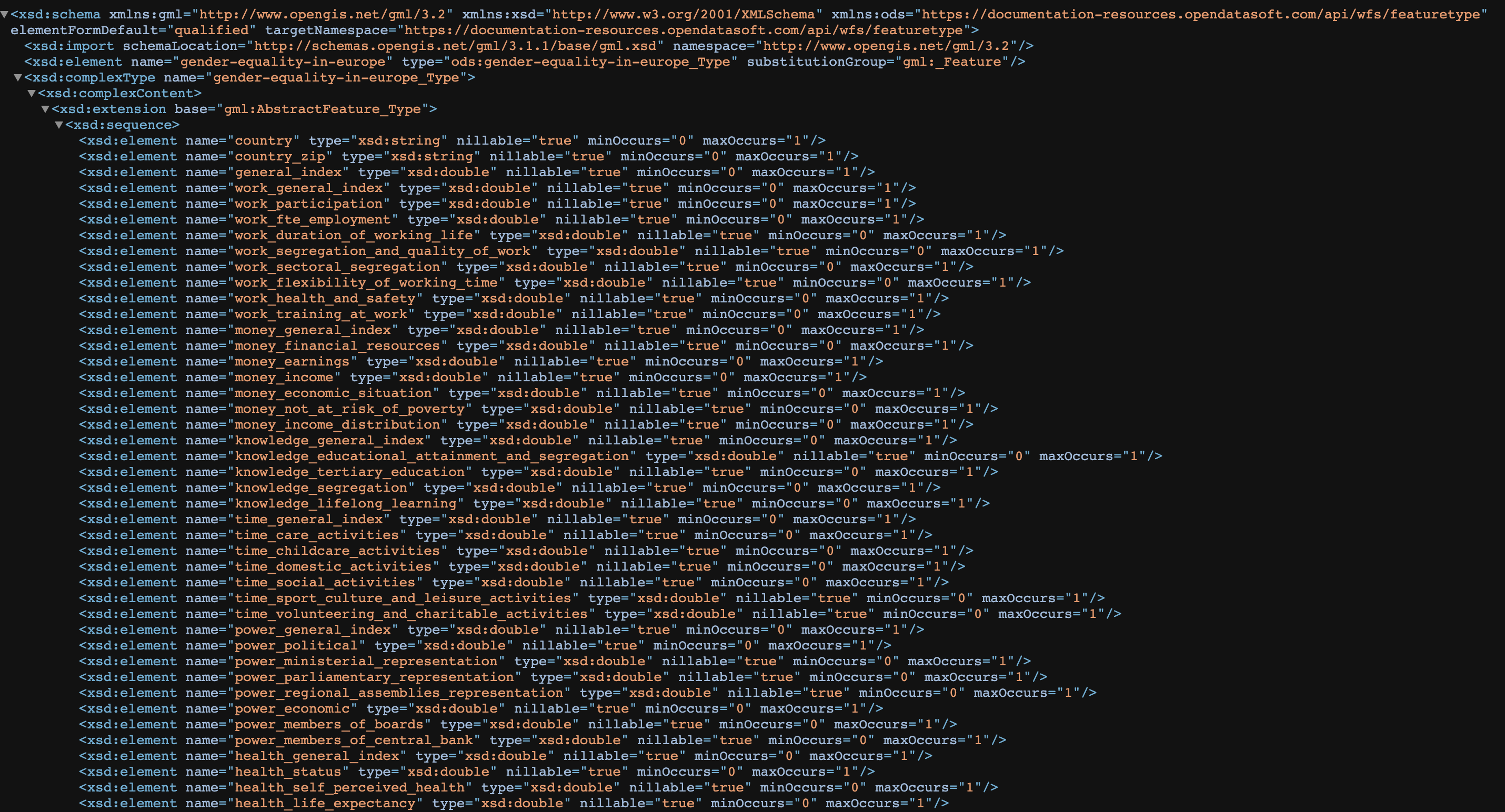 Dans WFS, le "typename" est l'identifiant d'un jeu de données. Dans l'exemple de GetCapabilities ci-dessus, l'un des ensembles de données de l'espace de travail "documentation-resources" avait le nom de type : "ods:gender-equality-in-europe". Nous l'utiliserons dans l'exemple ci-dessous.