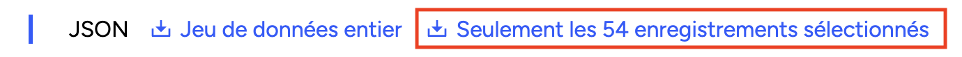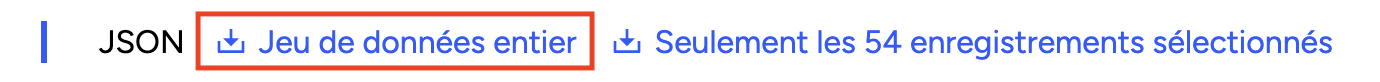 Les jeux de données peuvent être téléchargés dans différents formats. Si les formats de fichiers plats (CSV, JSON, Excel) sont toujours disponibles pour tout jeu de données, d'autres formats peuvent être disponibles, selon que le jeu de données contient ou non des coordonnées géographiques.