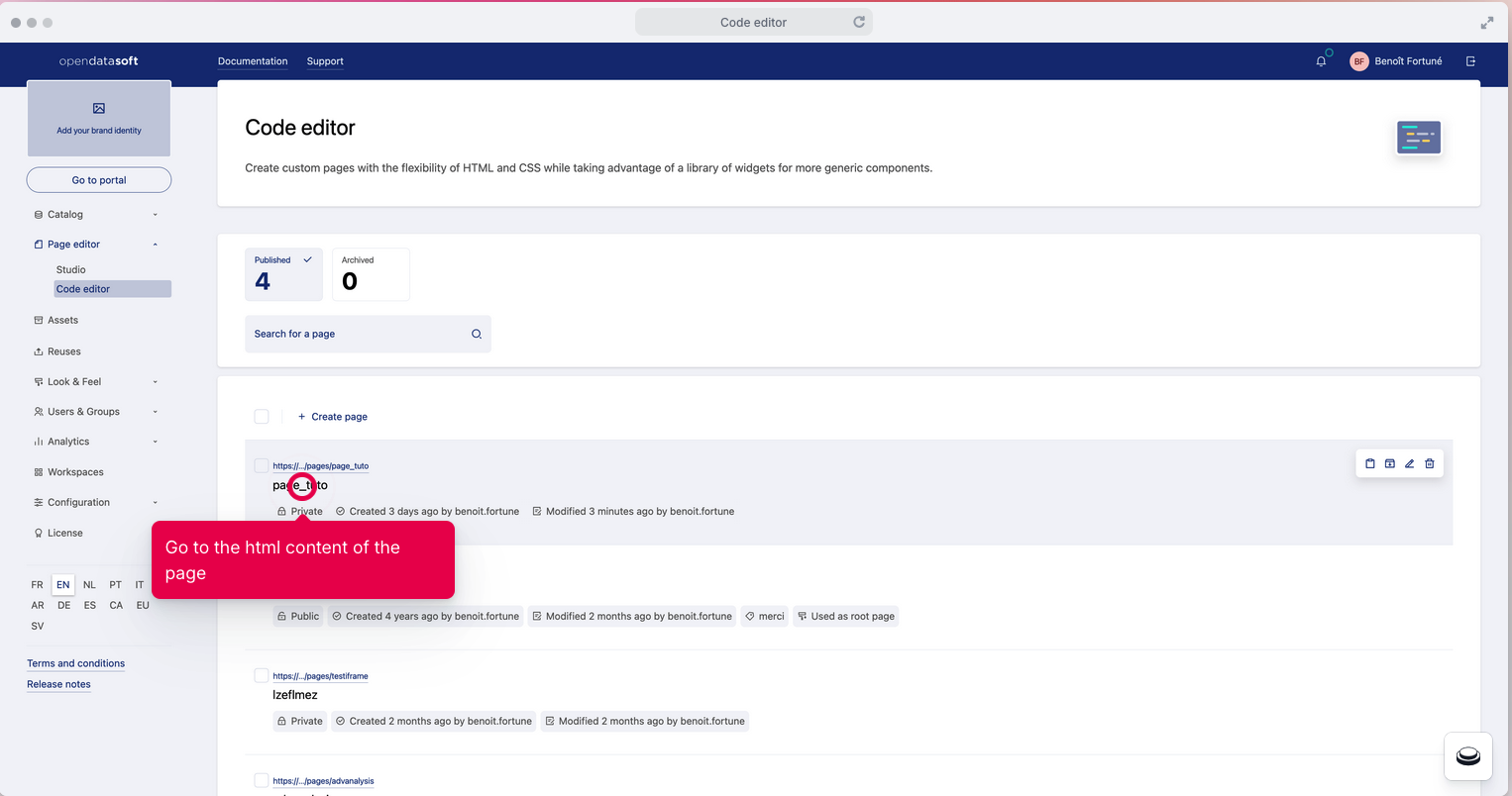 Pour les pages créées à l'aide de l'éditeur de code, l'intégration de la barre de recherche se fait de manière transparente grâce à l'utilisation du widget ods-catalog-search. Voici un exemple :