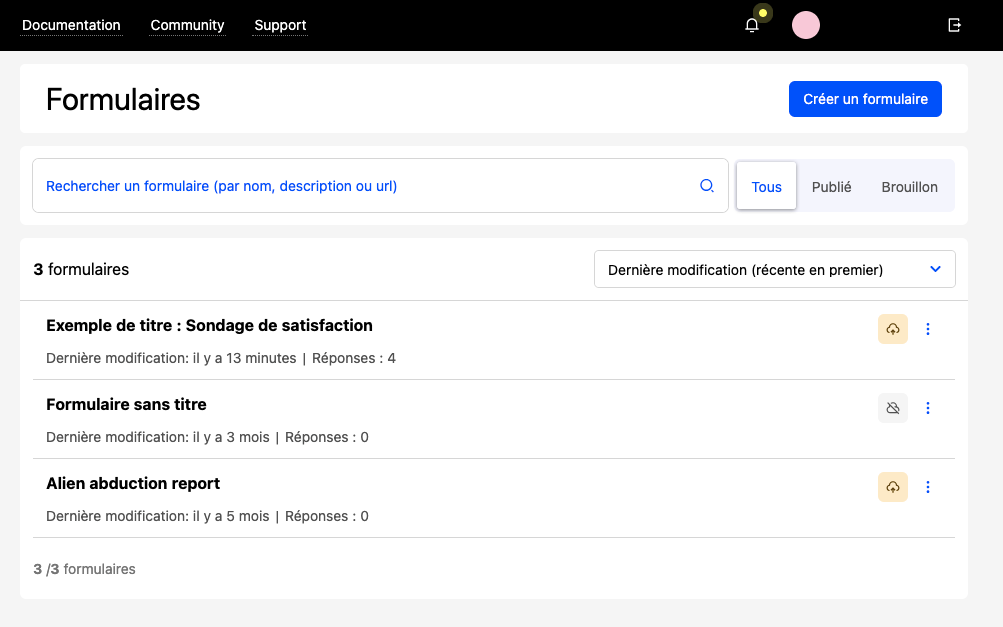 Vous pouvez rechercher un formulaire spécifique dans la barre de recherche, ainsi que filtrer la vue en cliquant sur Publié ou Brouillon à droite de la barre de recherche. Vous pouvez visualiser, modifier et publier ou dépublier un formulaire existant en cliquant dessus ou sur son menu à trois points. Enfin, vous pouvez également cliquer sur le bouton en haut à droite pour Créer un formulaire.