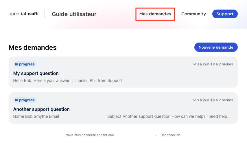 Si vous faites de multiples demandes de support dans le guide de l'utilisateur, vous pouvez désormais suivre chacune d'elles sur la page Mes demandes.