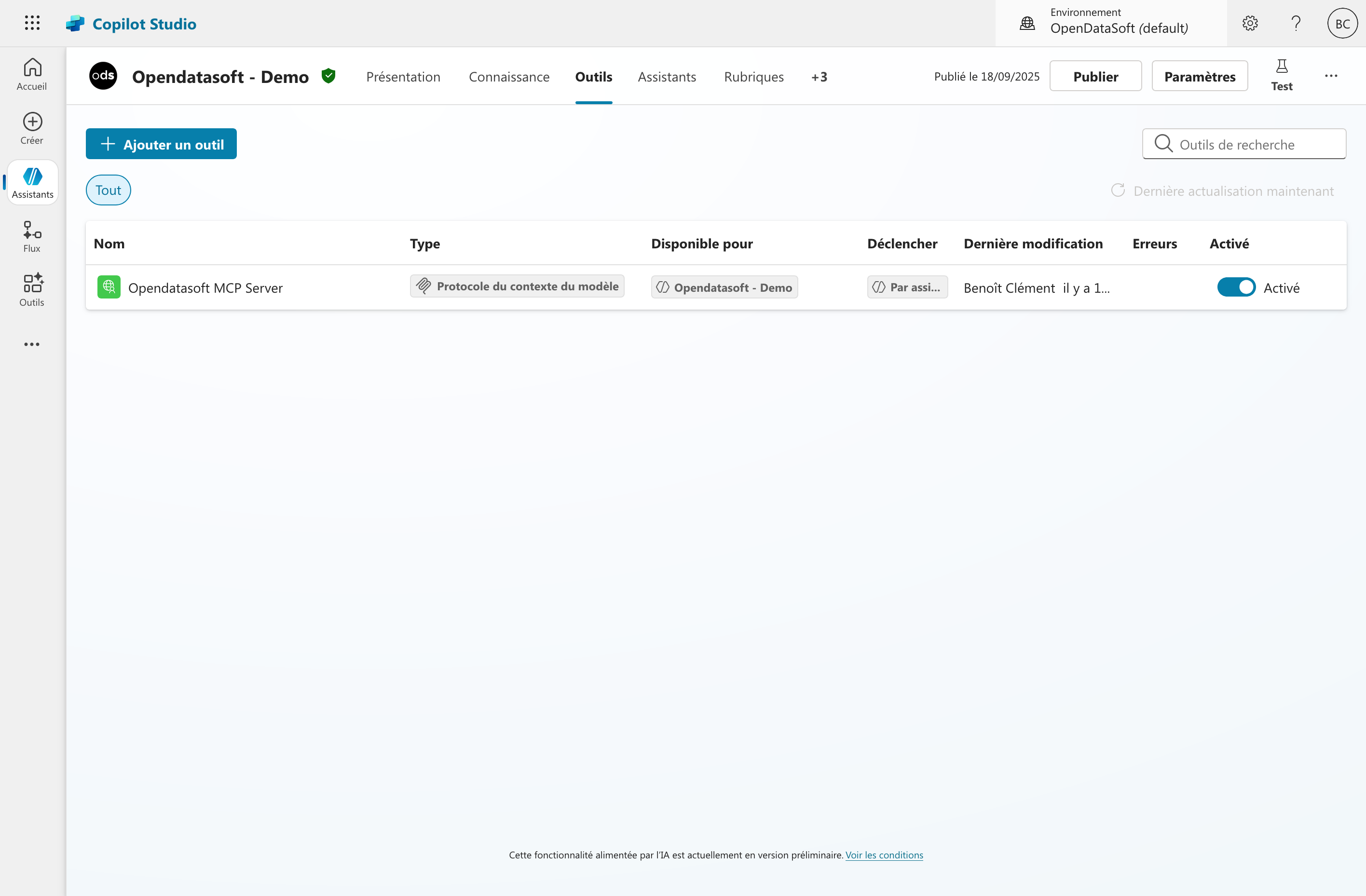 Le serveur MCP Huwise doit être déclaré comme l'un des outils de l'agent Copilot, et configuré avec une connexion personnalisée en suivant les instructions ici : Se connecter à un serveur Model Context Protocol (MCP) existant.
