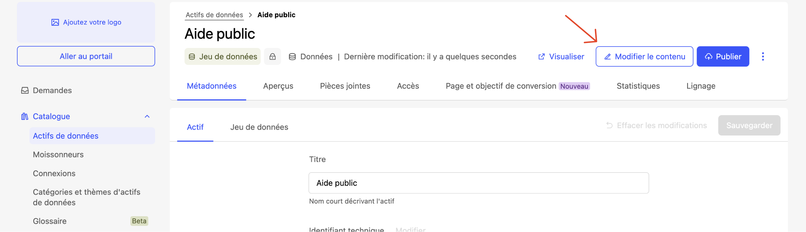 Configurer les métadonnées : titres, descriptions, tags et catégories. Les métadonnées sont ce qui rend votre actif visible dans le catalogue. Sans elles, les utilisateurs ne sauront pas qu'il existe.