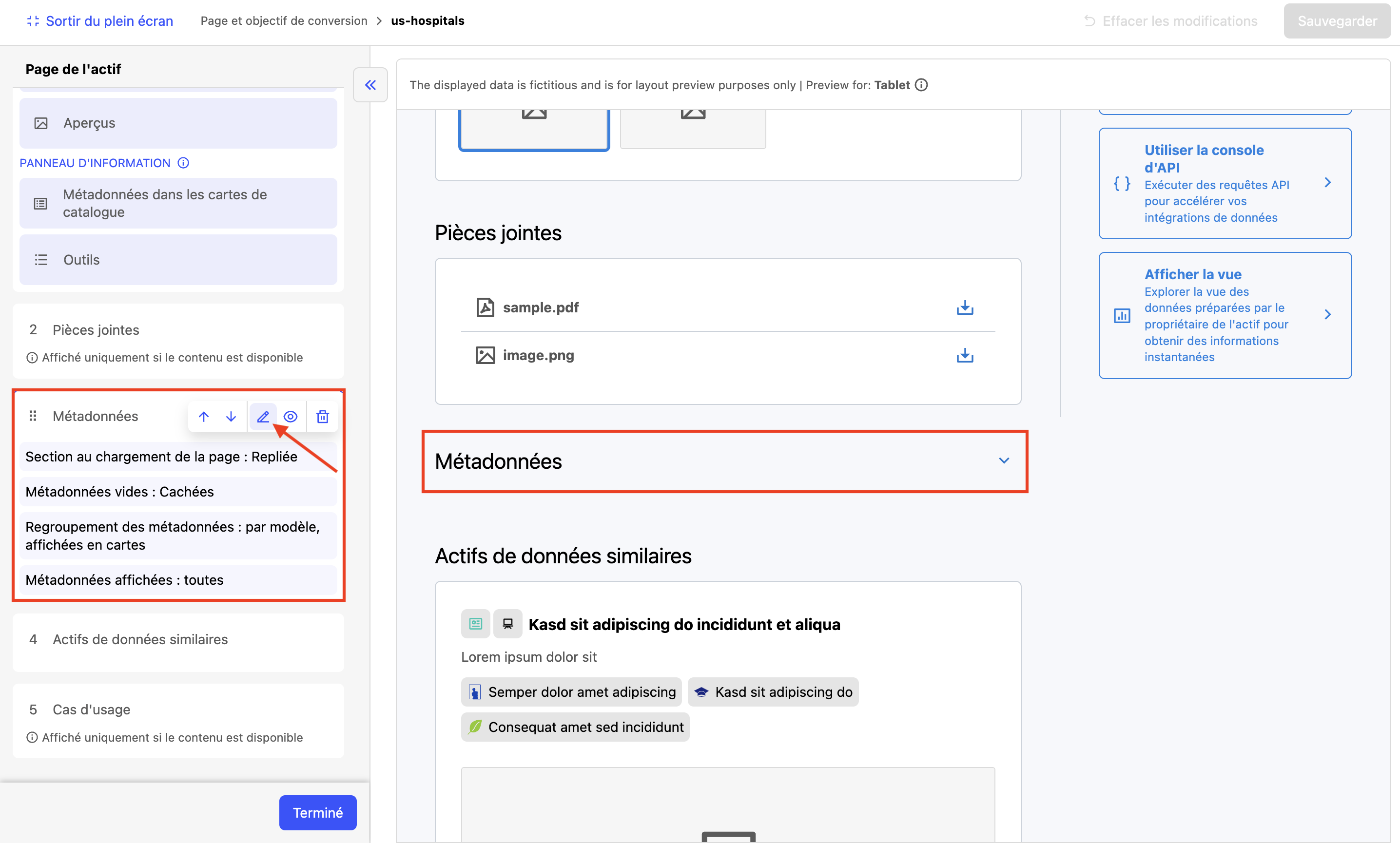 Comme les métadonnées peuvent être configurées de différentes manières, le panneau d’édition comporte un bouton Modifier dédié pour les gérer.
