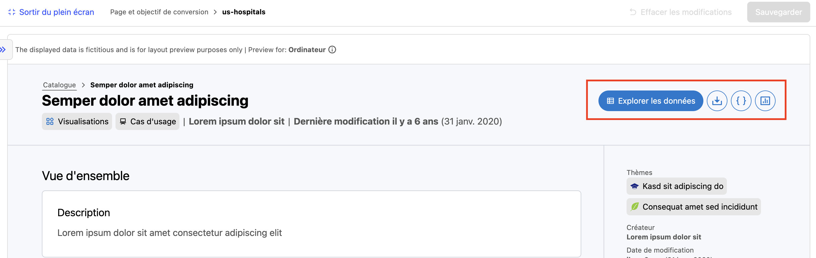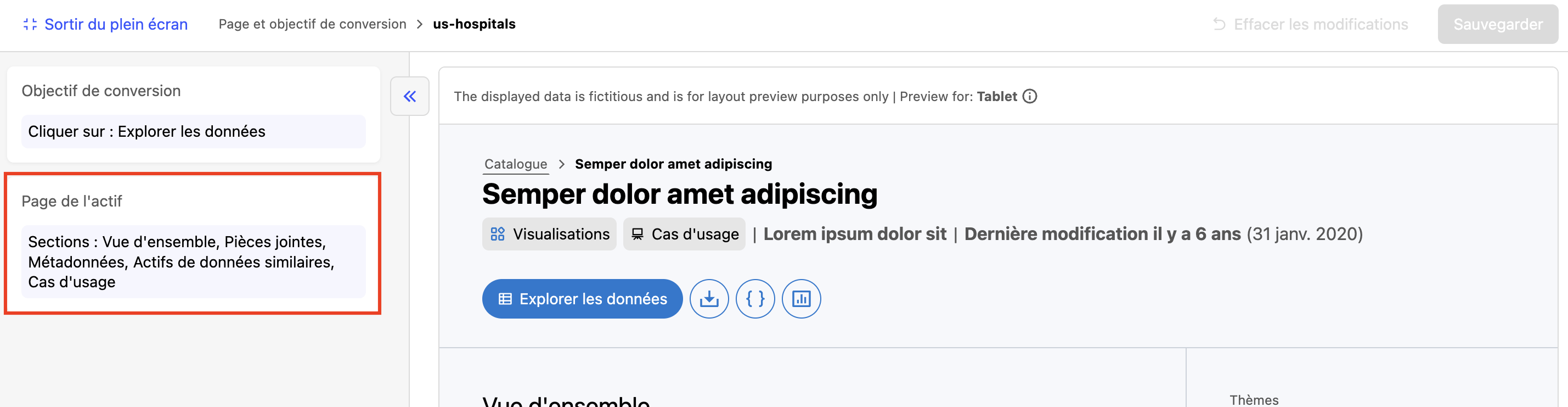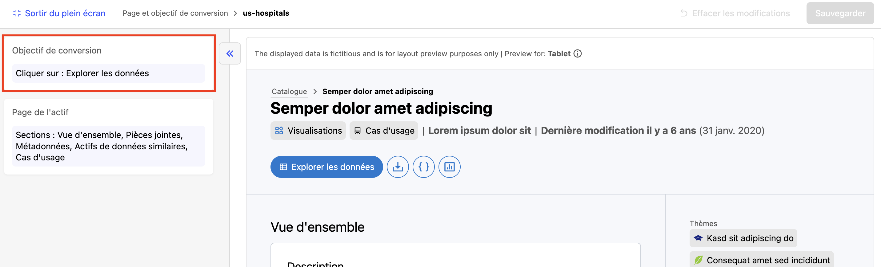Le CTA par défaut pour les jeux de données est Explorer les données. Pour le modifier, cliquez sur Objectif de conversion.