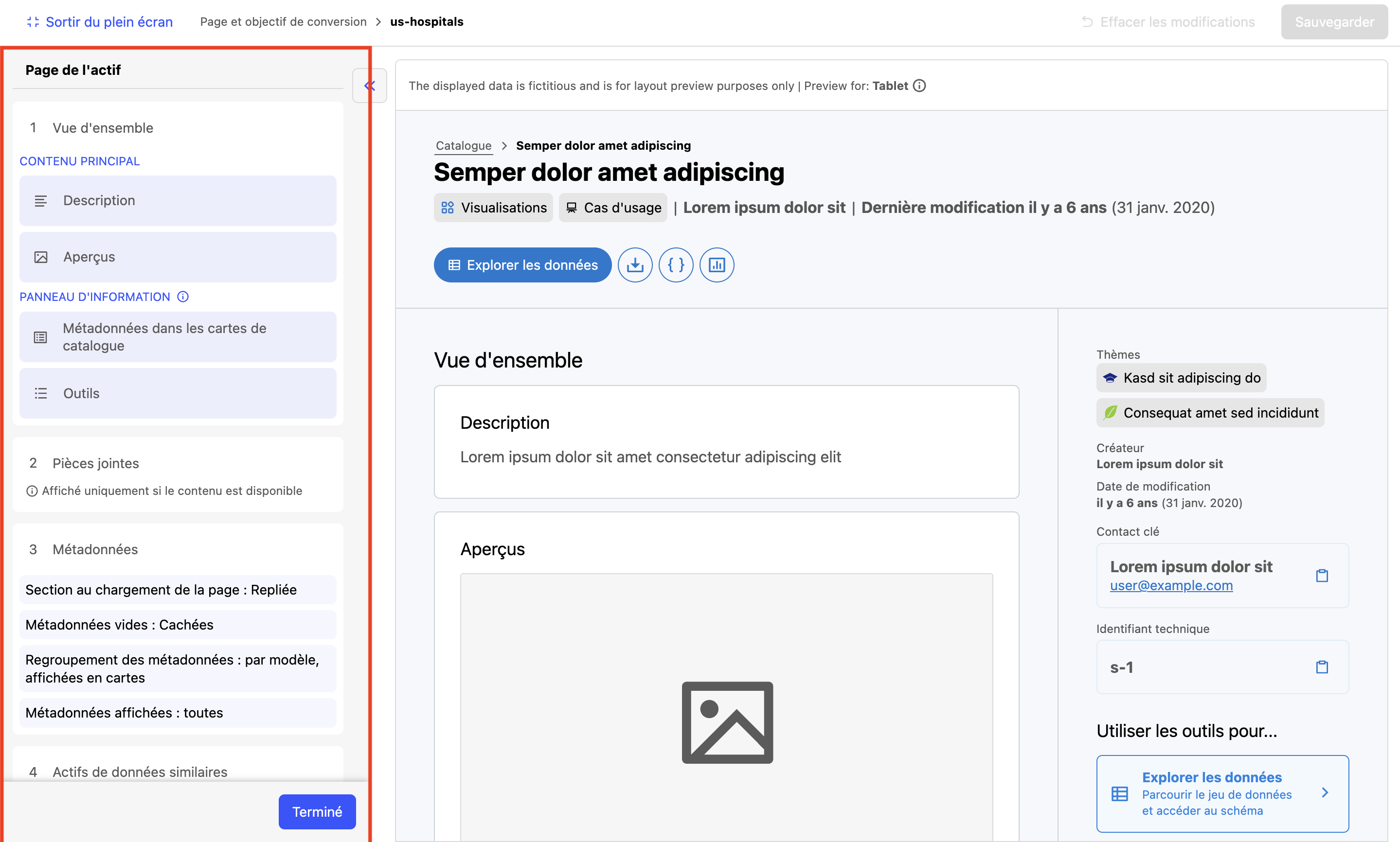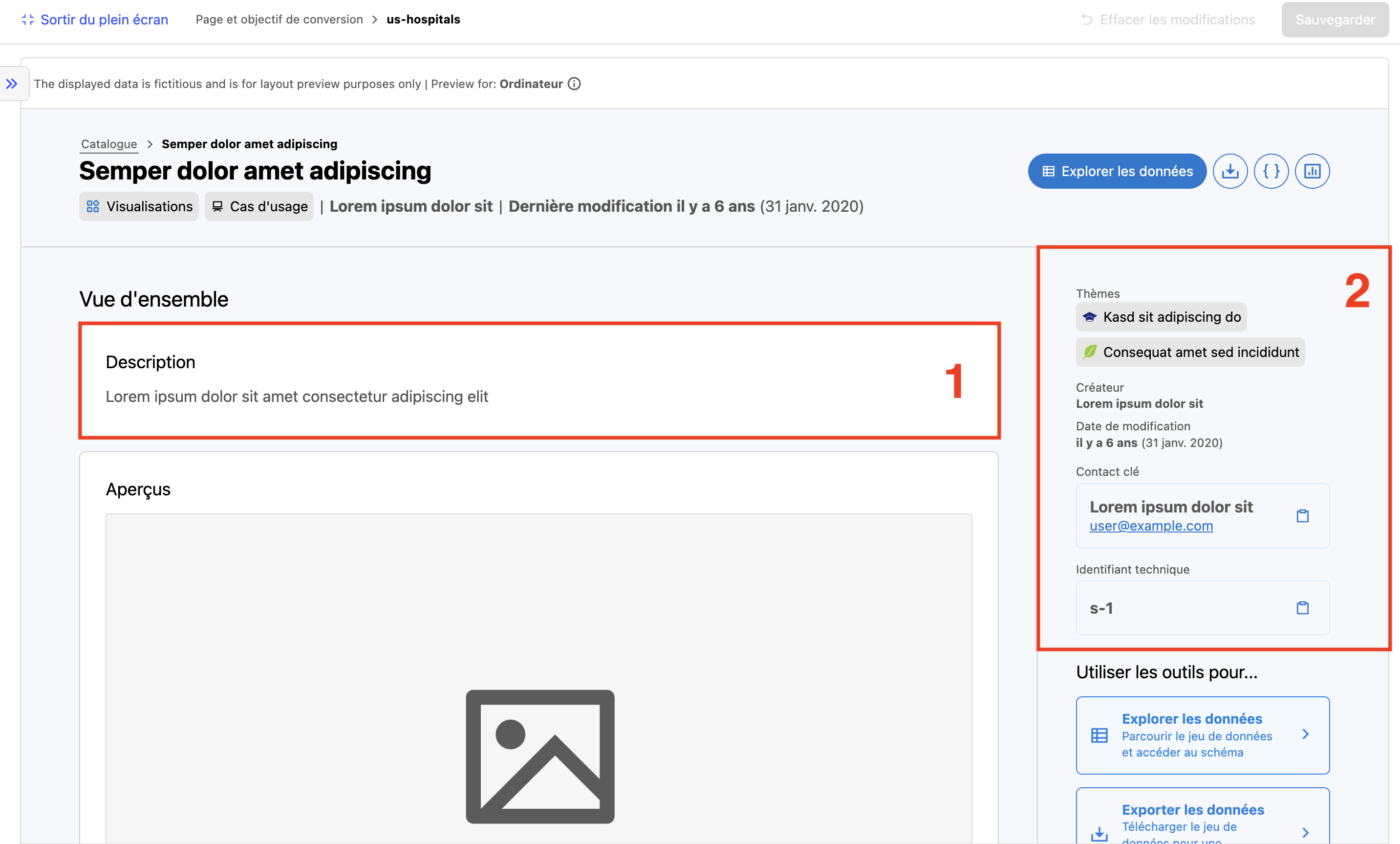 Métadonnées principales : thèmes, créateur, date de modification, contact clé, identifiant technique. Ces informations apparaissent dans le panneau latéral droit (ou sous le contenu principal sur mobile).