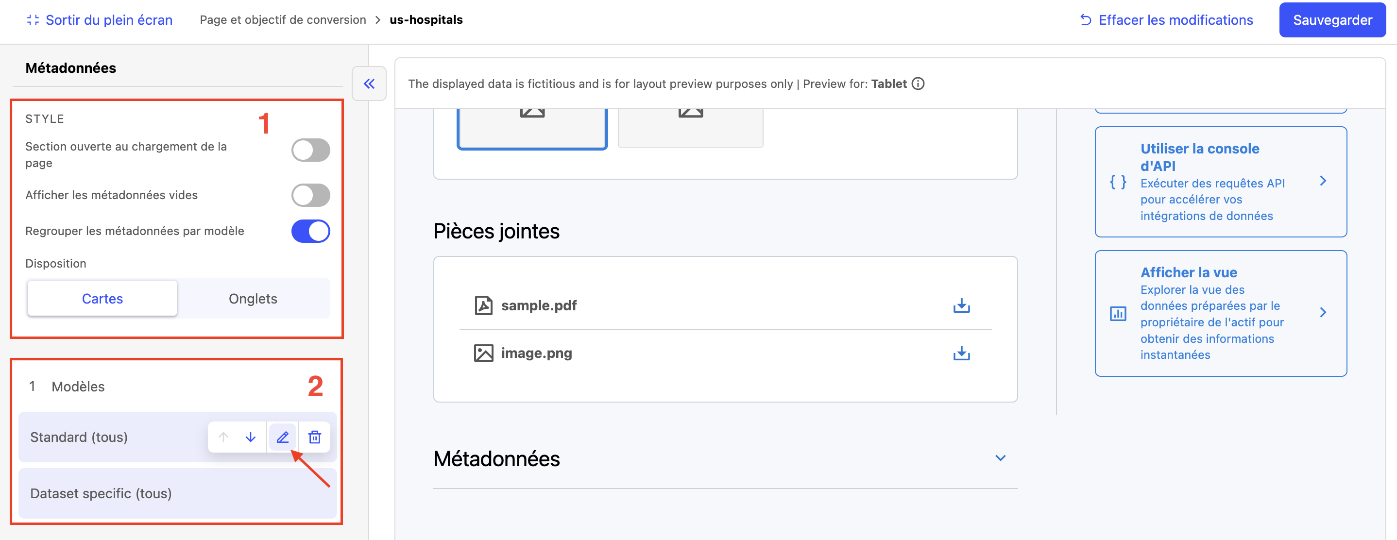 Si plusieurs modèles de métadonnées existent, vous pouvez contrôler lesquels apparaissent sur la page et dans quel ordre.