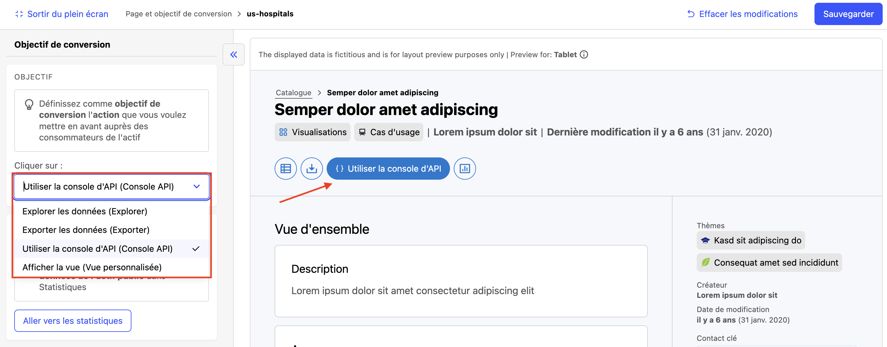 En tant que data publisher, vous choisissez votre objectif principal de conversion : le CTA qui reflète ce que vous attendez des utilisateurs. Exemple : pour un jeu de données de temps réel sur les transports publics destiné à des développeurs, l’objectif idéal pourrait être Utiliser la console d'API.