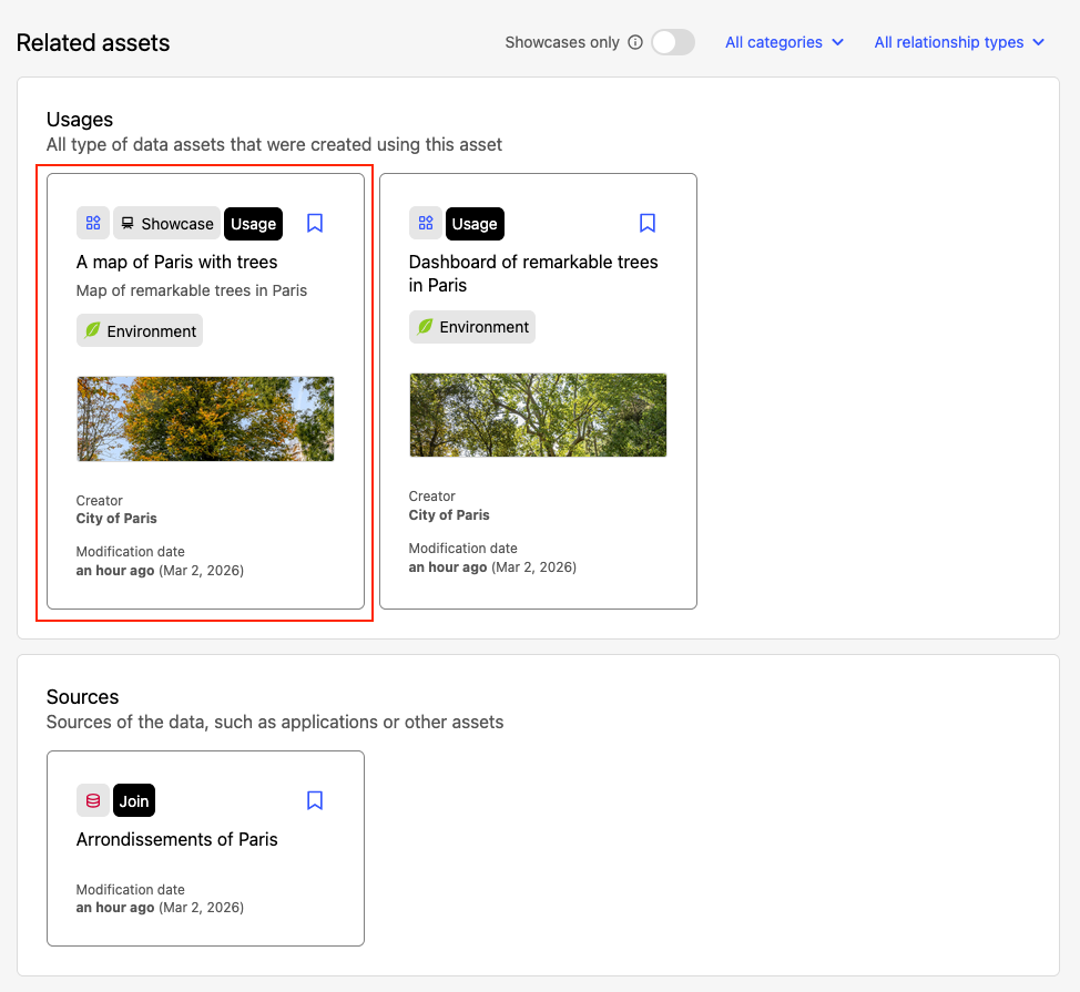 Vous pouvez également trouver des cas d'usage répertoriés directement sur la page de l'actif. Elles apparaissent désormais dans la section Actifs associés, sous le bloc Utilisations, aux côtés d'autres types de ressources qui utilisent cet ensemble de données, telles que les visualisations ou les ressources fédérées.